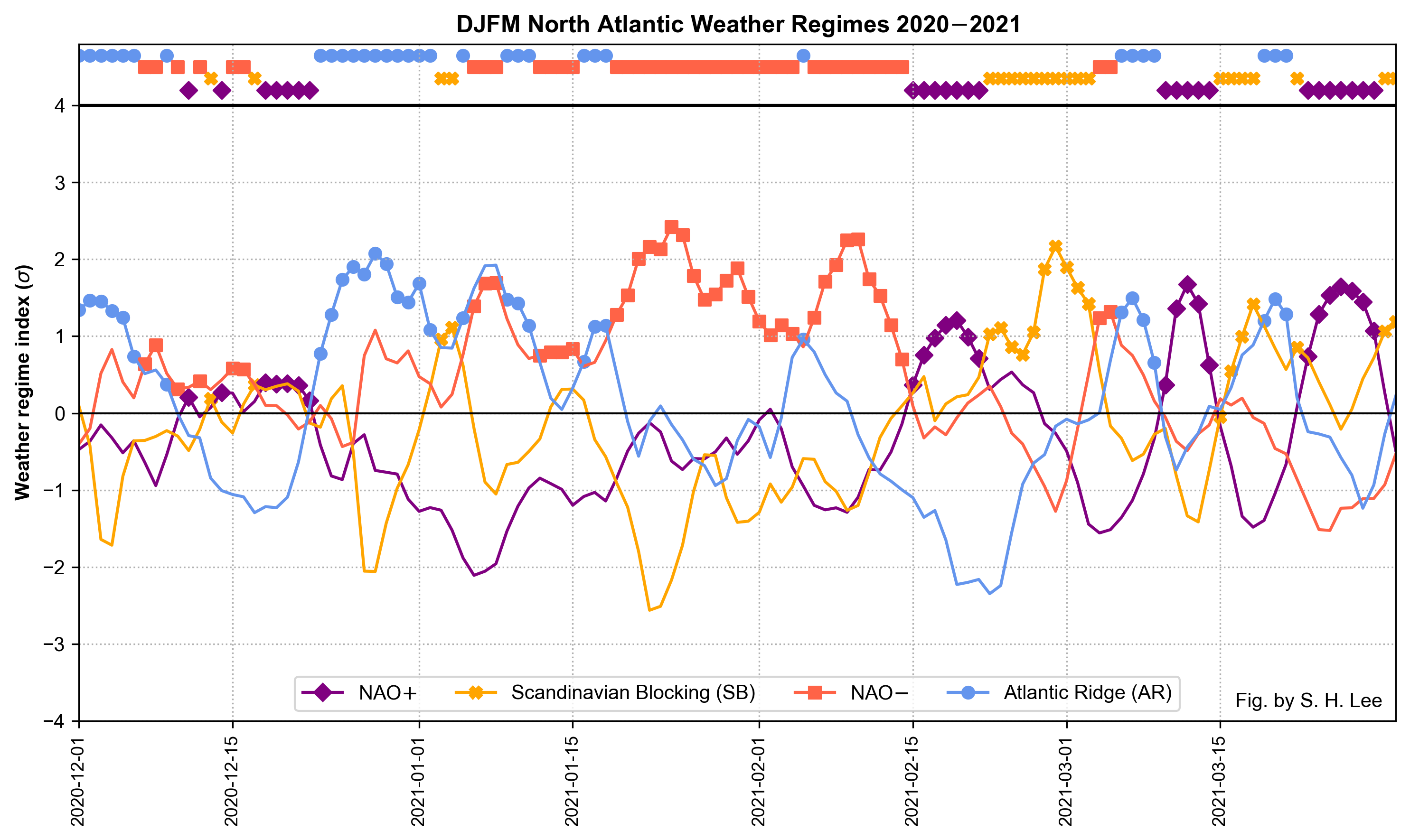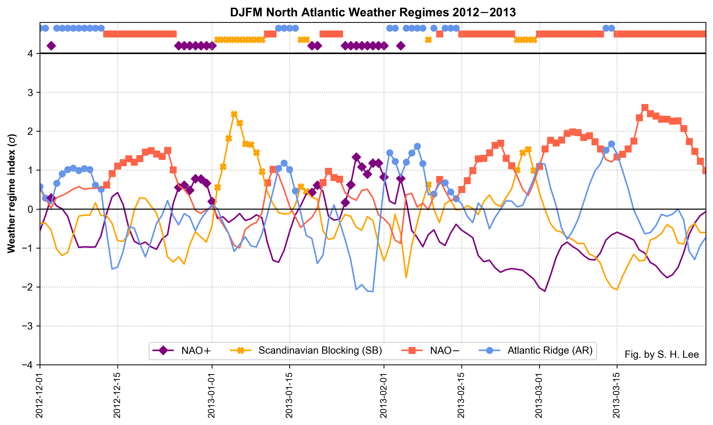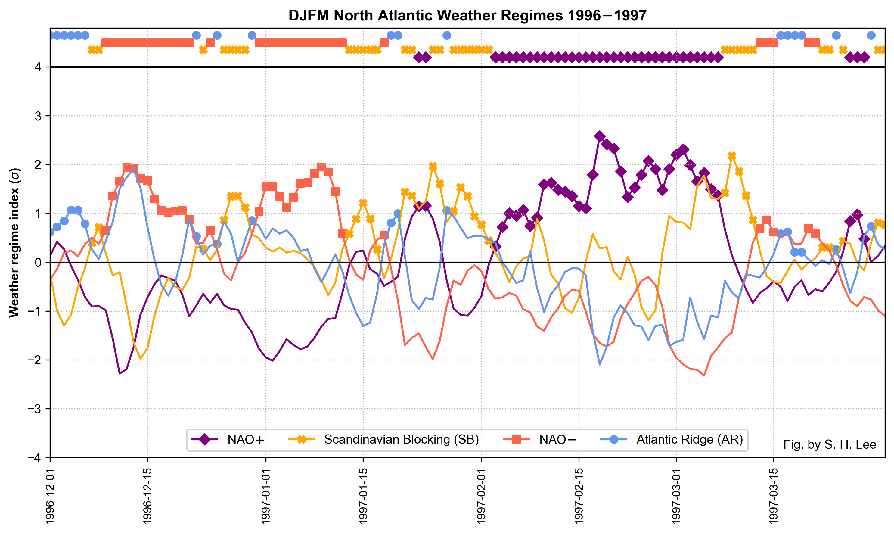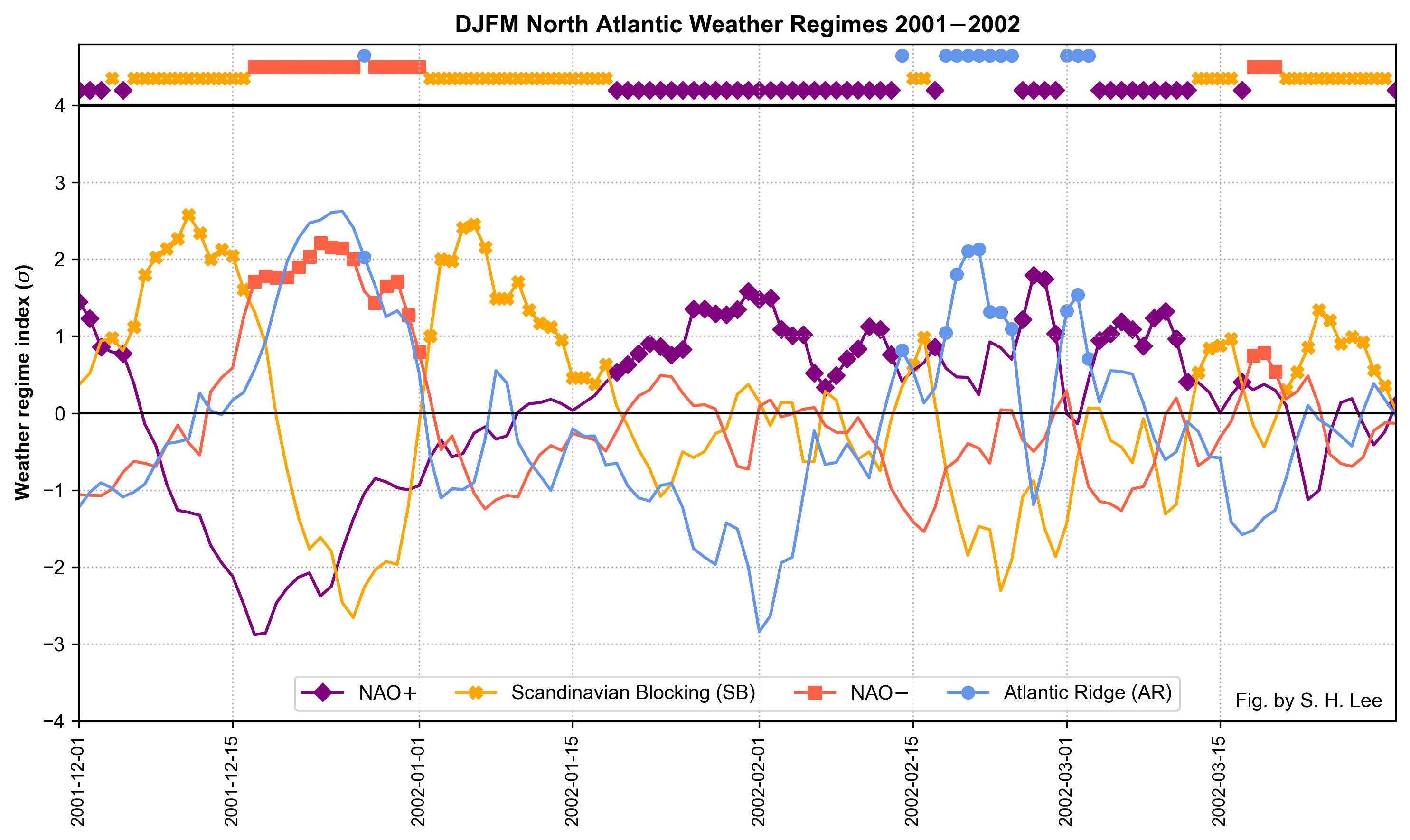 Weather regimes are recurrent, persistent and quasi-stationary circulation patterns which represent large-scale, low-frequency variability. The wintertime North Atlantic regimes are here computed following a similar method to Cassou (2008): k-means clustering (with k = 4) is performed on the leading 14 principal components of daily 00Z December–March 1.0° ERA5 linearly-detrended 500 hPa geopotential height anomalies in the region 20–80°N, 90°W–30°E, from 1 January 1979 – 31 March 2025. Each day is then assigned to a regime based on the minimum Euclidean distance to a cluster centroid (a ‘no regime’ class is not used). The four regimes are:
